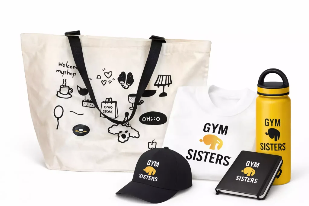 Custom everyday giveaways—bags, caps, notebooks, and drinkware—for marketing or retail use.