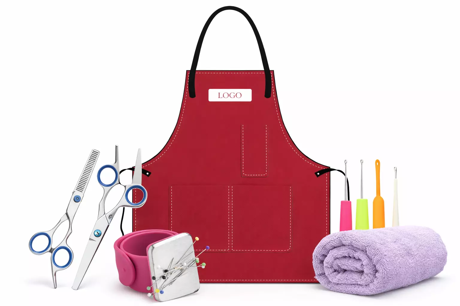 Aprons, towels, and accessories designed for salon campaigns and beauty brand promotions.